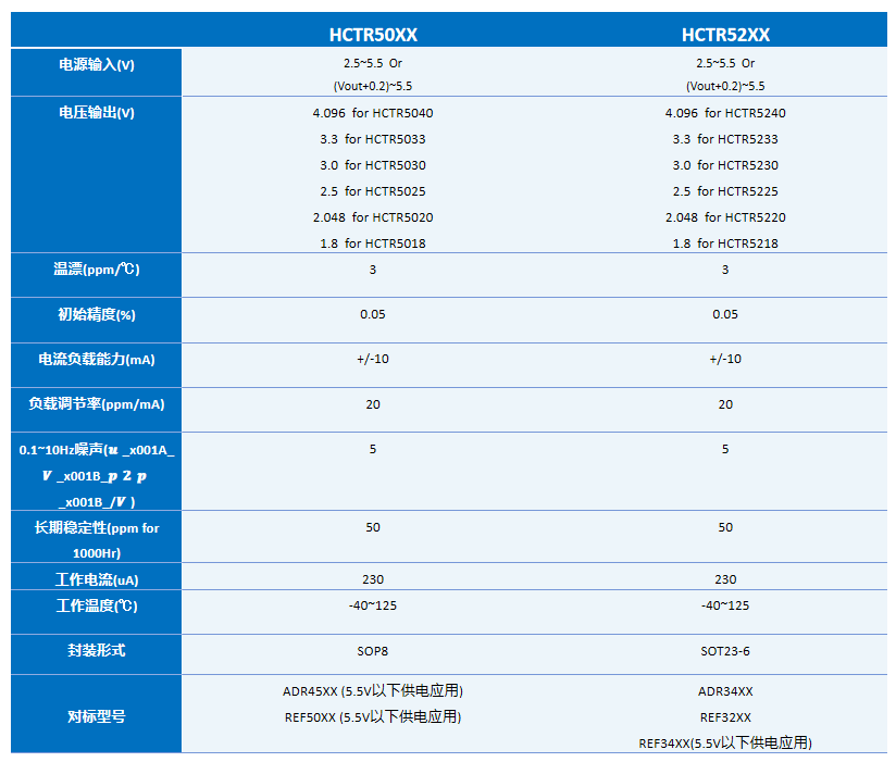 HCTR52XX为一款高精度、高性价比基准电压源,初始精度为0.05%,其既可用于给 ADC 芯片提供基准电压,也可以给 MCU、ADC、桥式电阻传感器等其他芯片或电路提供恒定的供电,供电电流需在+/-10mA 之内。其供电电压的准确度和噪声相比于 LDO 具有明显优势。