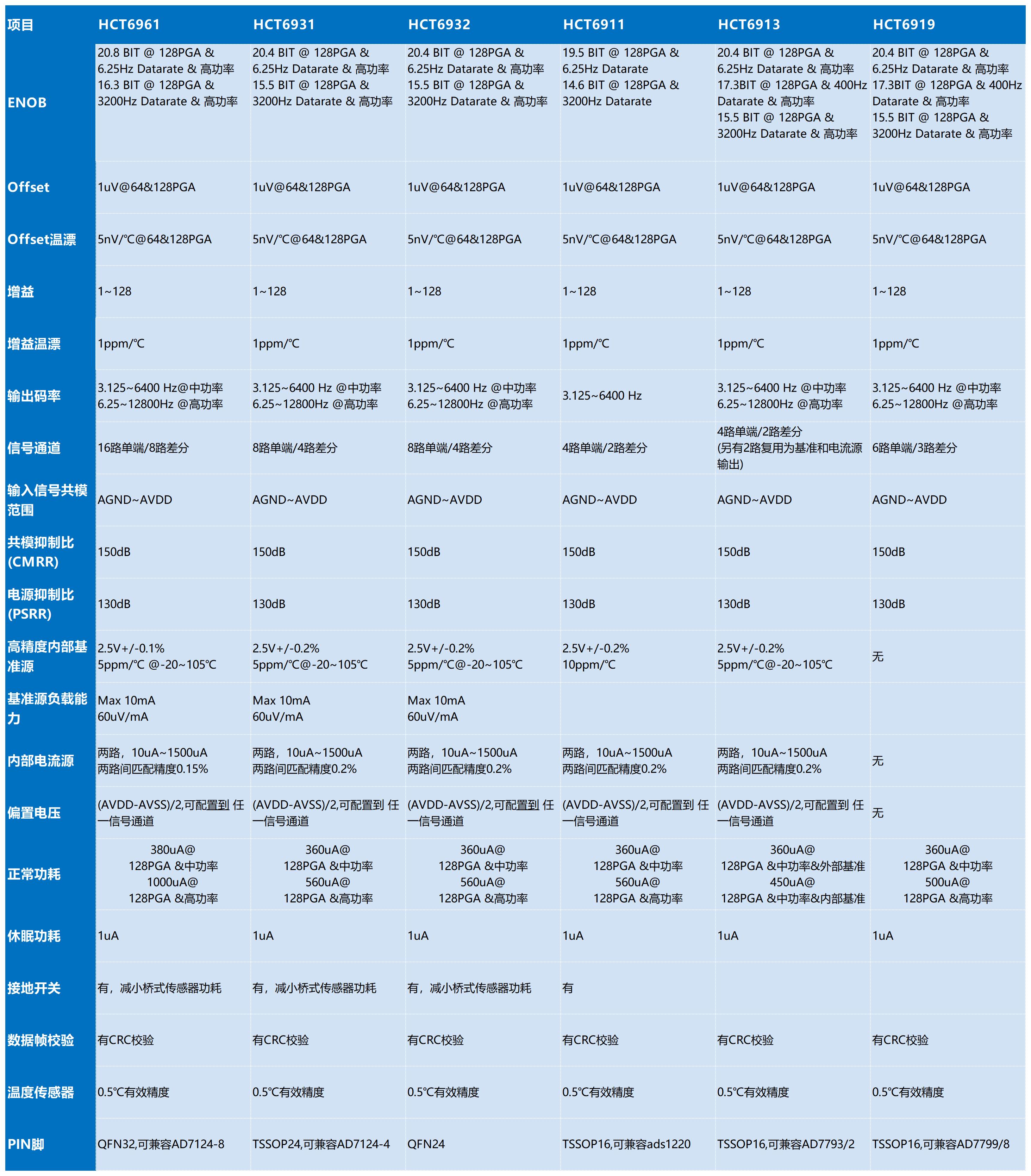 HCT69XX为24位高精度、低功耗、低零漂,集成高性能基准源、高匹配电流源的ADC系列,有效位数、零漂和温漂等性能与ADI/TI同类芯片相当,部分指标更优,可用于各类高性能温度传感器(热电偶、2~4线RTD电阻等)、分析天平、工业过程控制、心电监测、工业衡器、直流/交流电能测量、仪器仪表等各类需要高精度和低零漂测量的应用场合。